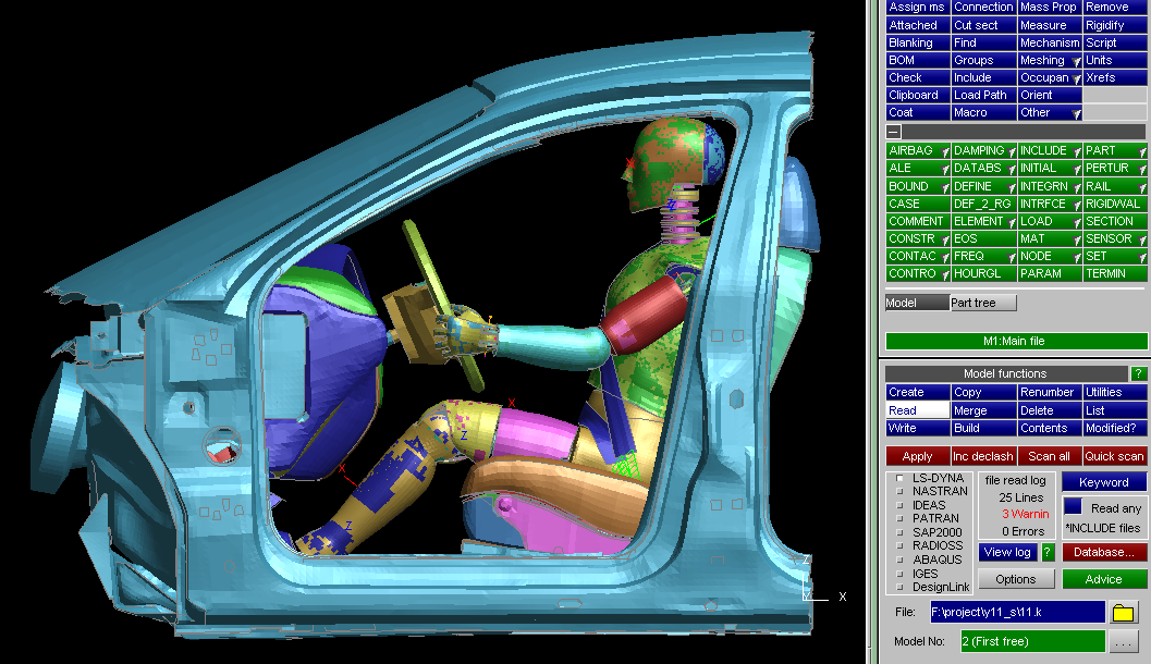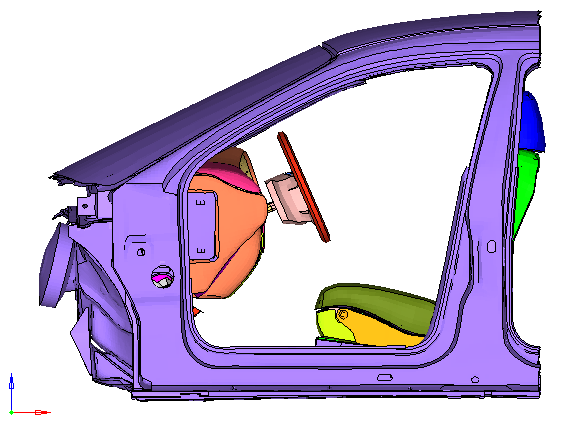 仿真过程:从整车模型中截取乘员仓、仪表盘、转向盘、座椅模型(也可以直接用整车),通过primer软件将假人放入车内,并调整坐姿,缠绕安全带,折叠气囊。给模型添加速度,加速度脉冲就可以进行仿真,后处理读取假人各部位伤害值。
